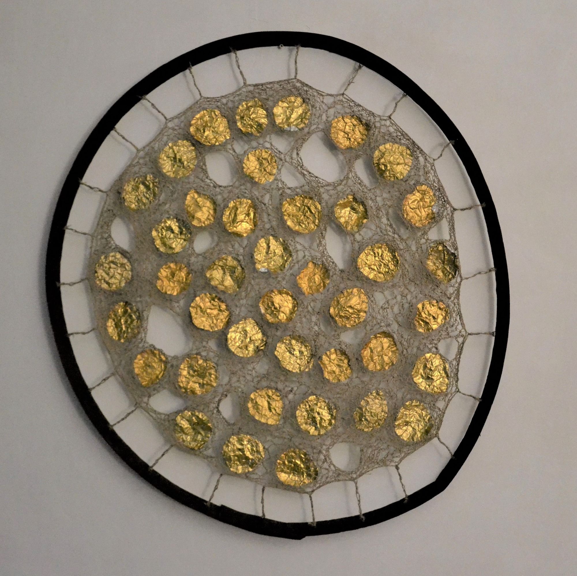 Je récupère des matériaux du quotidien que je relie en jouant du crochet. Les cercles de tonneaux ou d'anciens chassis cadrent la création qui sans eux n'est rien. La lumière filtre les oeuvres murales ou suspendues relevant les contenus.